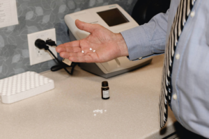 O neurologista Greg Jicha com comprimidos de nicorandil usados em um ensaio clínico que testa um tratamento para LATE - Morgan...