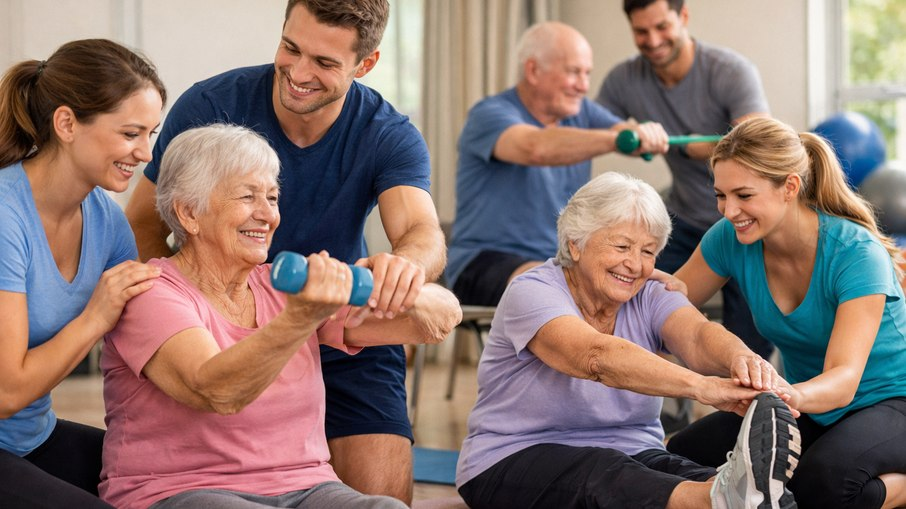É nesse momento que aparece um elemento que fará toda a diferença para envelhecer com qualidade de vida: cuidar do corpo e da mente. E ter ajuda para executar os exercícios faz toda diferença, principalmenente se for de um fisioterapeuta, que traz orientação profissional, avalia limite, dor, mobilidade, postura e equilíbrio. Diferente de um movimento genérico ou improvisado, o trabalho fisioterapêutico previne lesões, fortalece musculaturas essenciais para atividades simples (levantar, sentar, caminhar, tomar banho), reduz dores crônicas e melhora a coordenação. Além disso, ele consegue adaptar exercícios à história do idoso — cirurgias, osteoporose, artrose, quedas anteriores — garantindo segurança e progressão.