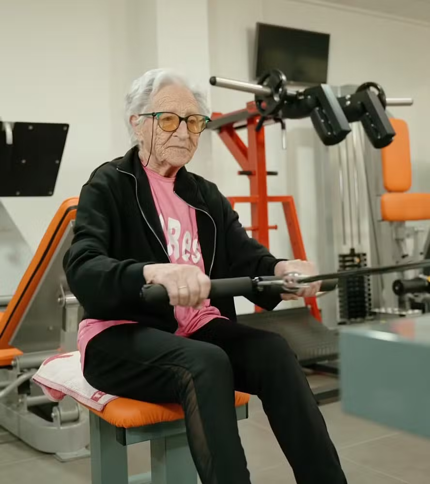 Mesmo convivendo com osteoartrite, uma condição que causa rigidez e dor nas articulações devido à degeneração da cartilagem protetora nas extremidades dos ossos, a centenária não deixa de ir um dia na academia.