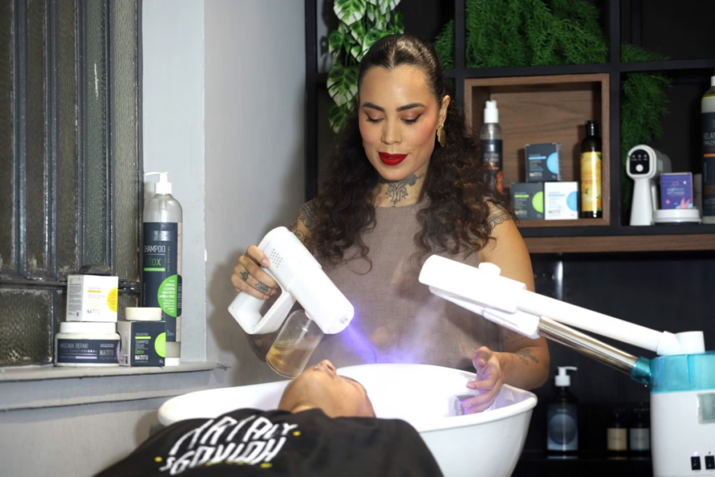 “Quando comecei, há quase dez anos, havia muita carência de serviços para esse nicho. Além de não existir muitos espaços, a maioria era voltada para relaxamento à base de produtos químicos. Eu quis trazer não apenas a questão do corte, mas também a pegada de produtos mais naturais, e menos agressivos, focados em problemas que as clientes enfrentavam no cotidiano”, explica.